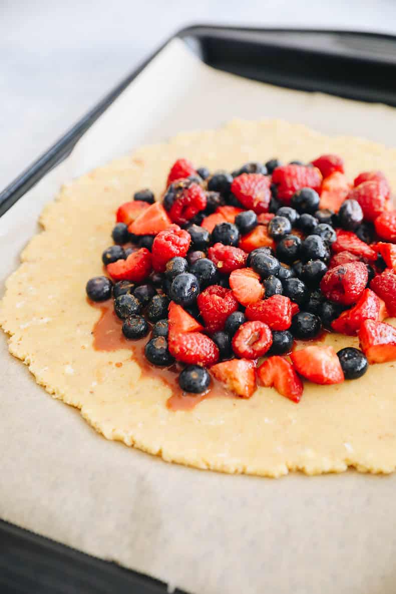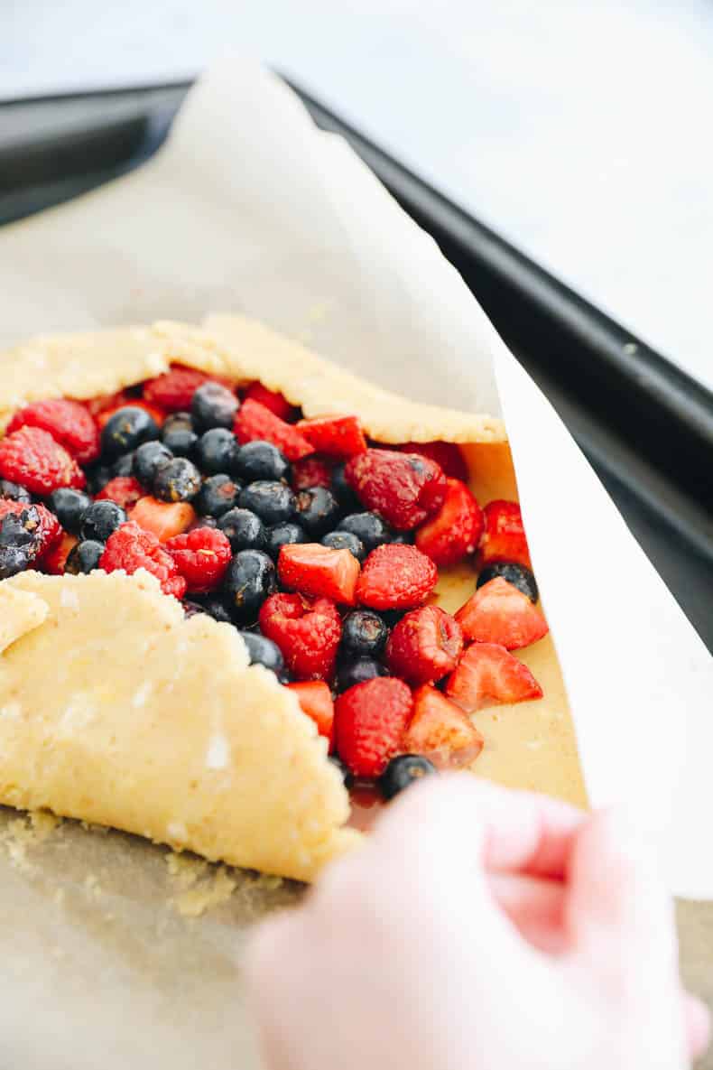 - Slowly fold crust over the filling all around the edges by using the parchment paper and folding it over the berries. Use your hands to fix any broken spots. Don’t worry if crust breaks, just repair with your hands and it will be totally fine once it’s baked.