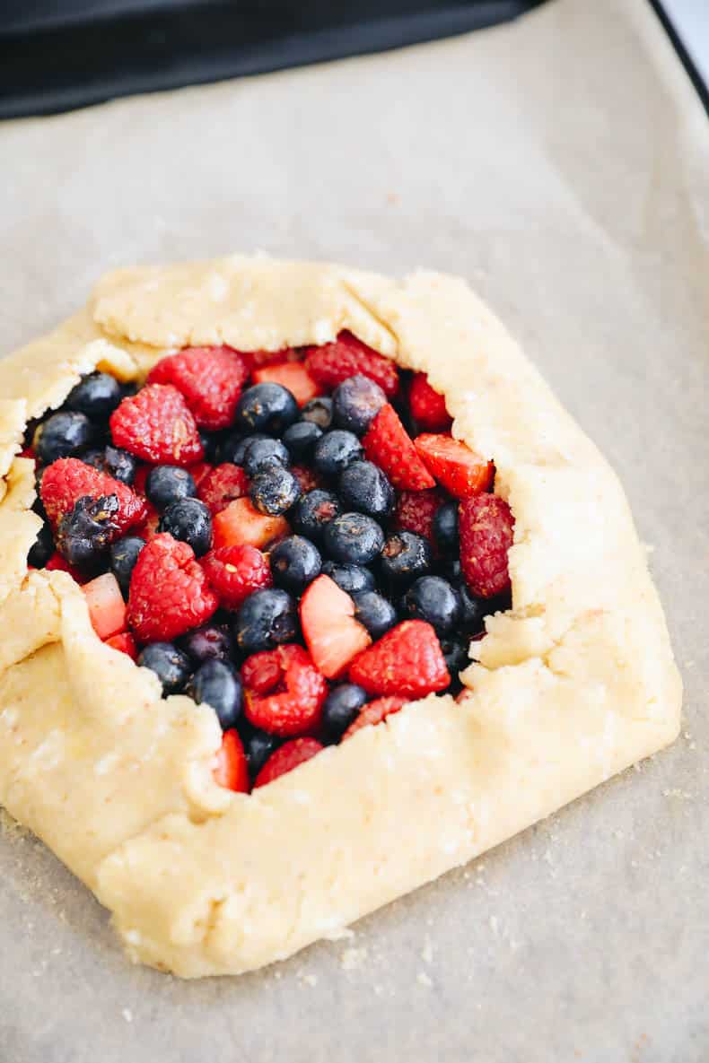 Remove crust from fridge and add filling to the center of the crust, leaving at least a 2 inch perimeter for folding over. Slowly fold crust over the filling all around the edges by using the parchment paper and folding it over the berries. Use your hands to fix any broken spots. Don’t worry if crust breaks, just repair with your hands and it will be totally fine once it’s baked. Place in the oven to bake for 25-30 mins or until golden brown around the edges. Let cool for 20 mins before serving.