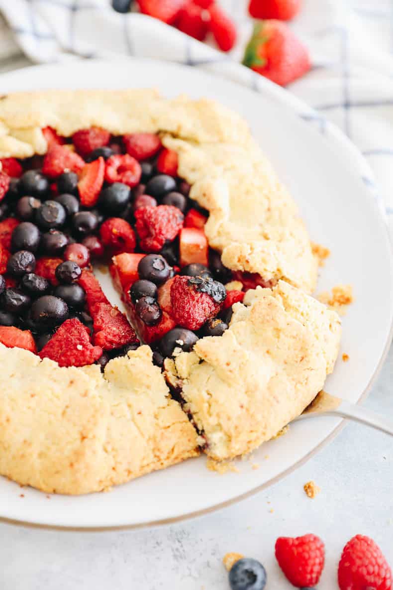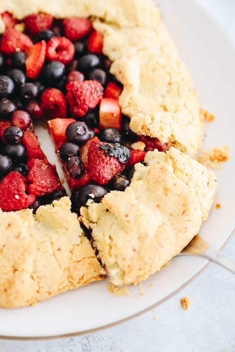 Skip the pie (and the grains!) in this healthier almond flour berry galette. Made with an almond flour and tapioca flour crust and a juicy berry filling this gluten-free galette recipe will be a hit for your next party.