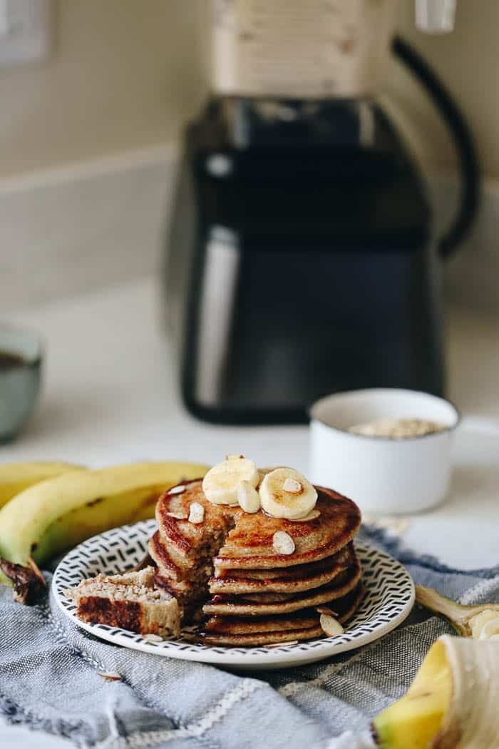 – Oat flour – If you’ve never subbed regular flour for oat flour, you’re in for a treat. Not only is oat flour a fantastic source of fiber and plant-protein, but it also adds a delicious nuttiness and sweetness to the recipe. You can purchase pre-bought oat flour but to be honest, I would just save the money and add regular rolled oats to the blender to grind them to a fine powder before adding the rest of your pancake ingredients.