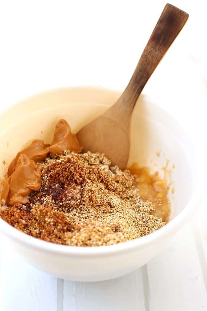 In a large bowl, combine rolled oats, quinoa, baking powder, cinnamon and salt. Add in the mashed bananas, flaxseed, peanut butter, coconut oil and maple syrup. Stir until well combined. Stir in any optional add-ins and let the mixture sit for 10 minutes so the flaxseed can absorb some liquid.