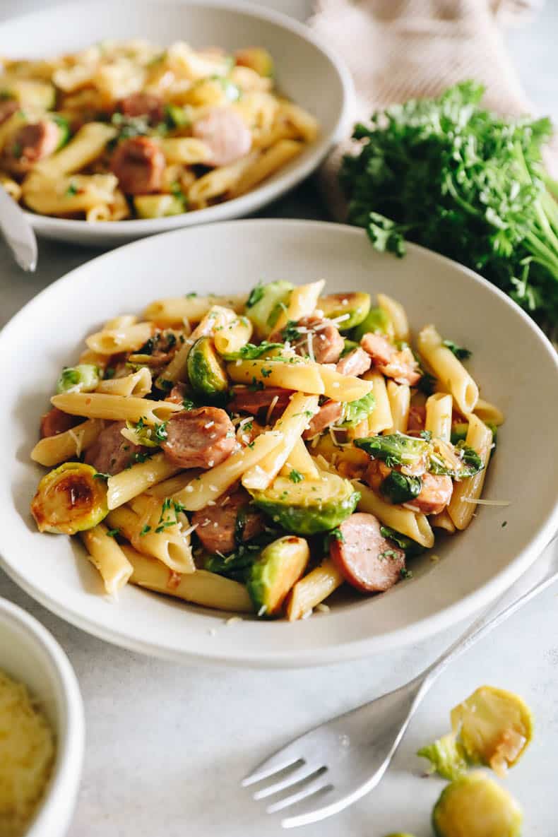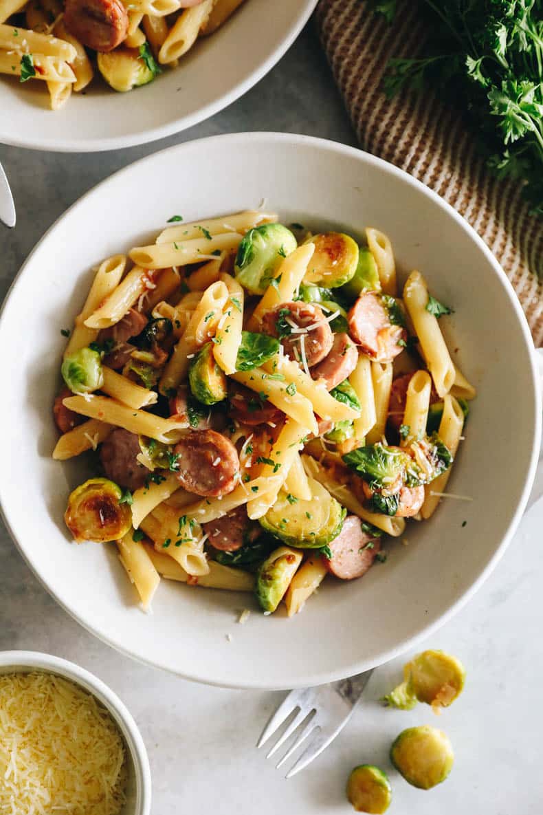 Keep it simple with this delicious and hearty chicken sausage pasta recipe. Juicy chicken sausage is paired with brussel sprouts and al dente pasta in a family-favorite recipe for any weeknight!