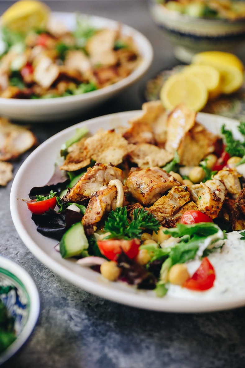 Get the best of the Middle East with this deconstructed chicken shawarma bowl. Made with oven-roasted chicken thighs, crispy pita chips and a delicious Israeli chickpea salad this healthy dinner recipe will quickly become a family favorite.