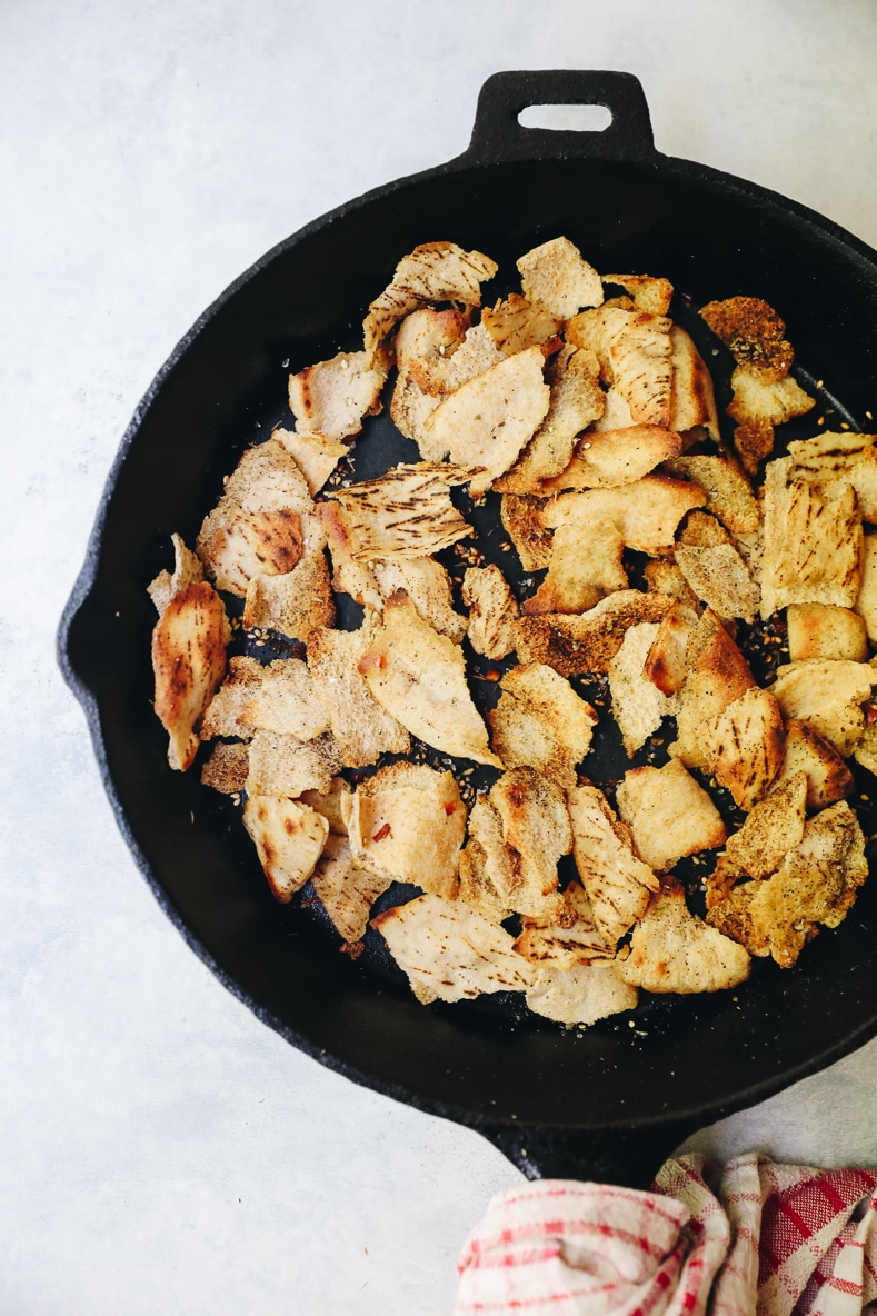 - Meanwhile, make the pita chips: heat the olive oil in a medium pan over medium heat. Add the pita and cook for 5 to 6 minutes, stirring all of the time, until the pita is crunchy and golden brown. Remove from the heat and mix in the salt, red pepper flakes and za’atar if using (it’s delicious!)