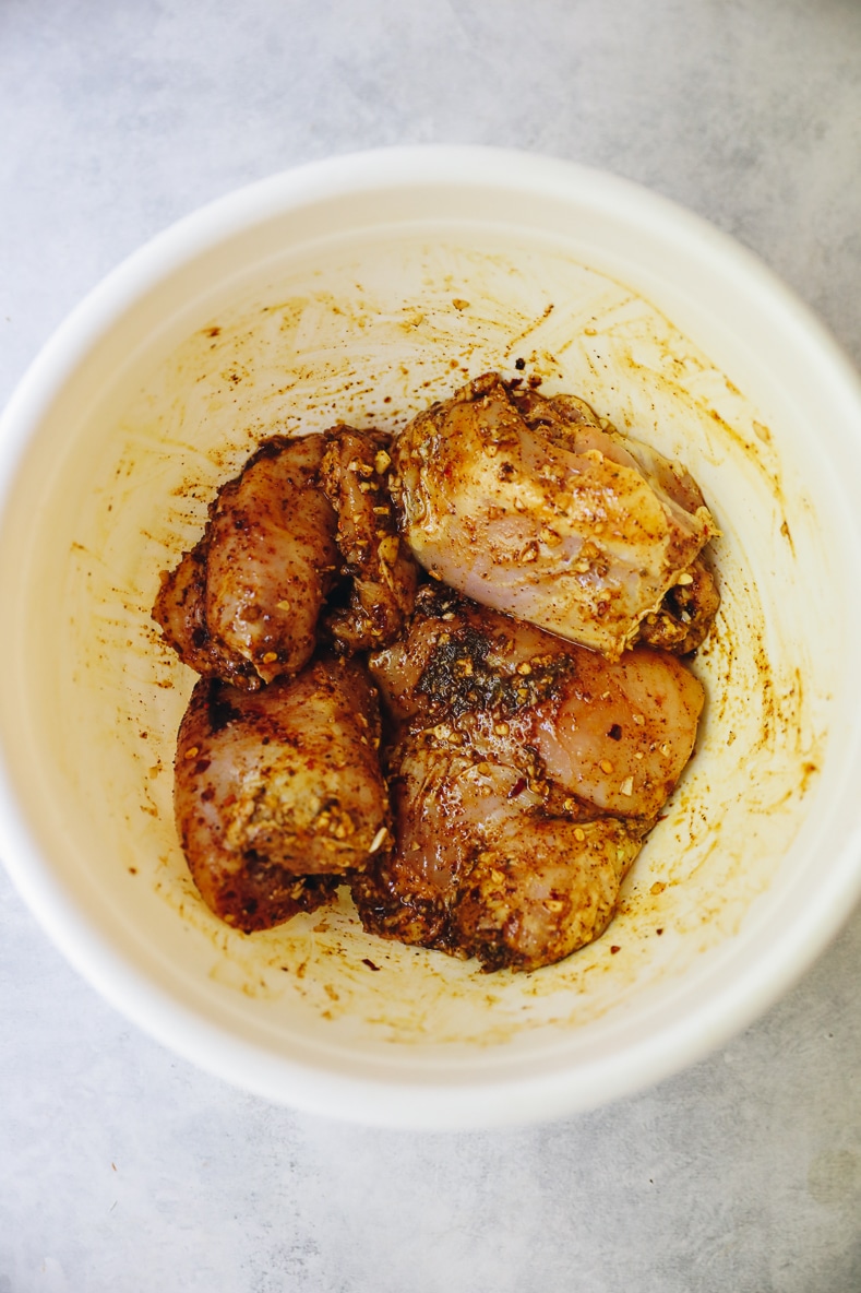 - Top chicken thighs with lemon, olive oil, garlic and spices and marinate for at least 30 minutes (can marinate overnight, if desired).