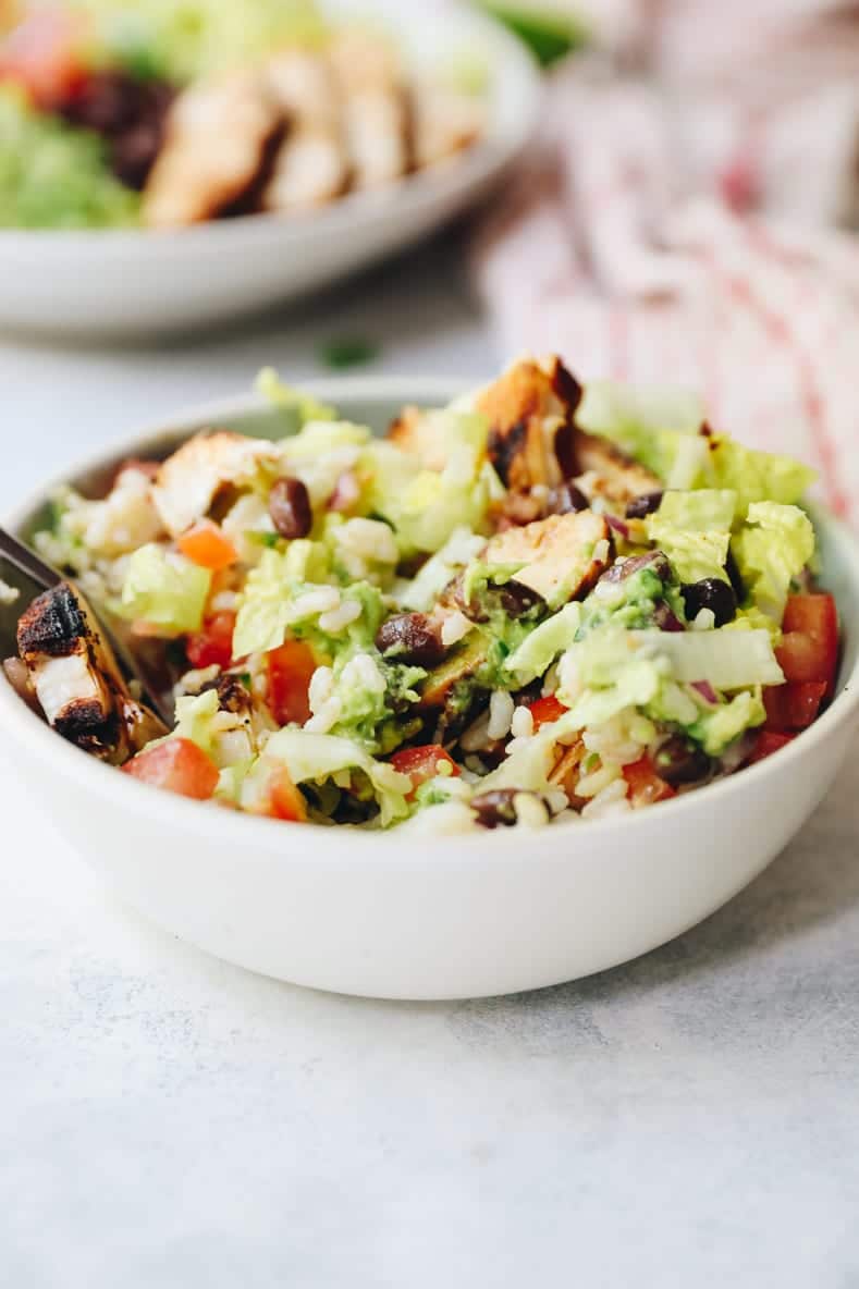 No need for takeout with this Copycat Chipotle Chicken Burrito Bowl! Made just like your favorite restaurant’s burrito bowl, this recipe is filling, healthy and can be made simple with pre-mixed ingredients or homemade options.