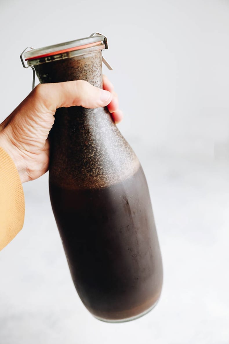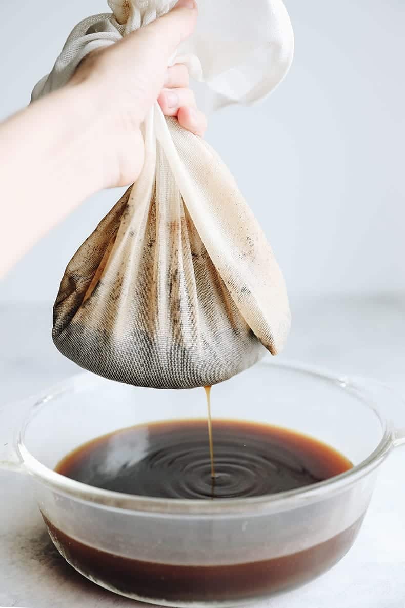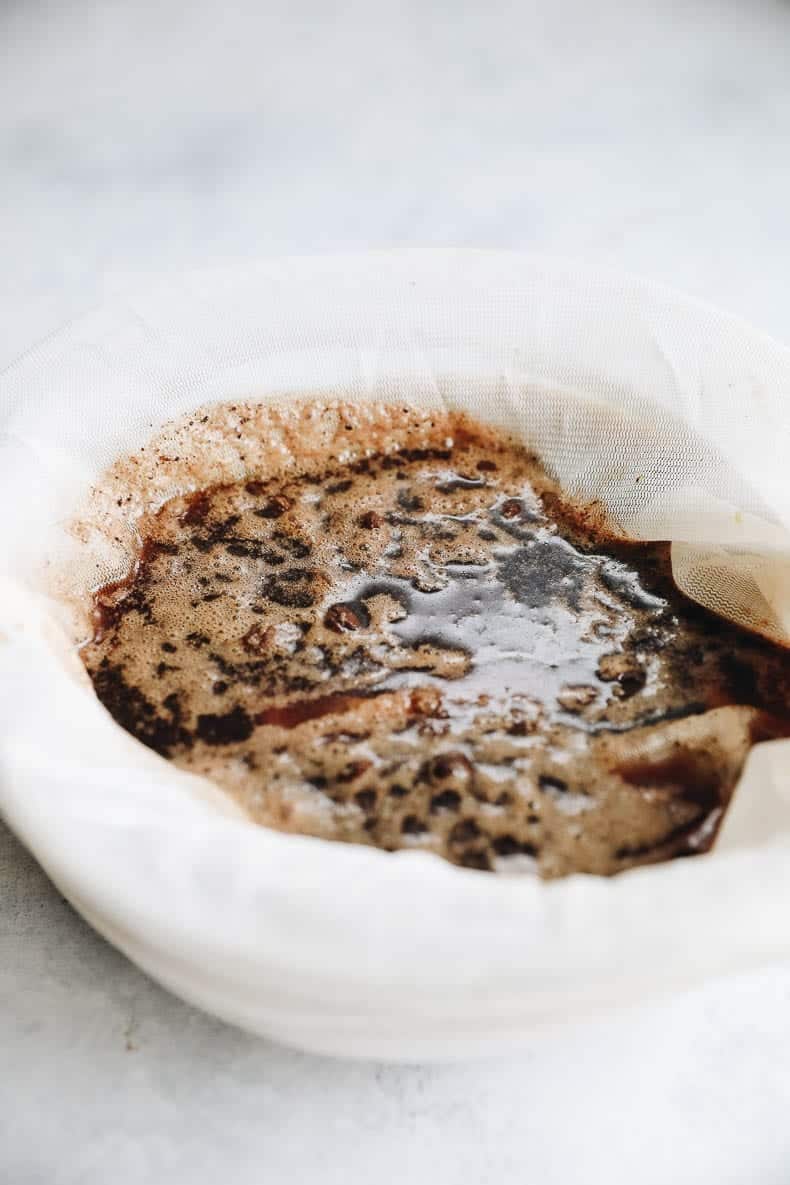 - Strain coffee through two layers of cheese cloth over a large bowl or jug or use a nut-milk bag (that’s what I use).