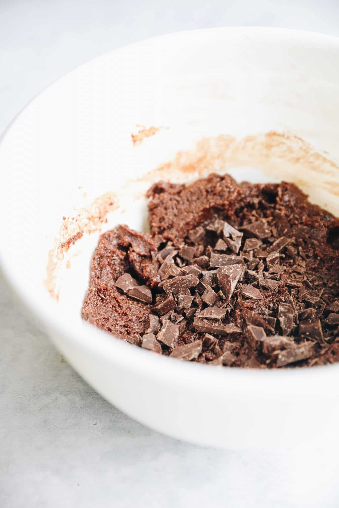 STEP 1: Start by mixing all wet ingredients (almond butter, honey and egg) into a large bow.. Add in the cocoa powder and coconut flour. The mixture should thicken up but you can add more coconut flour 1 teaspoon at a time if the batter is too wet.