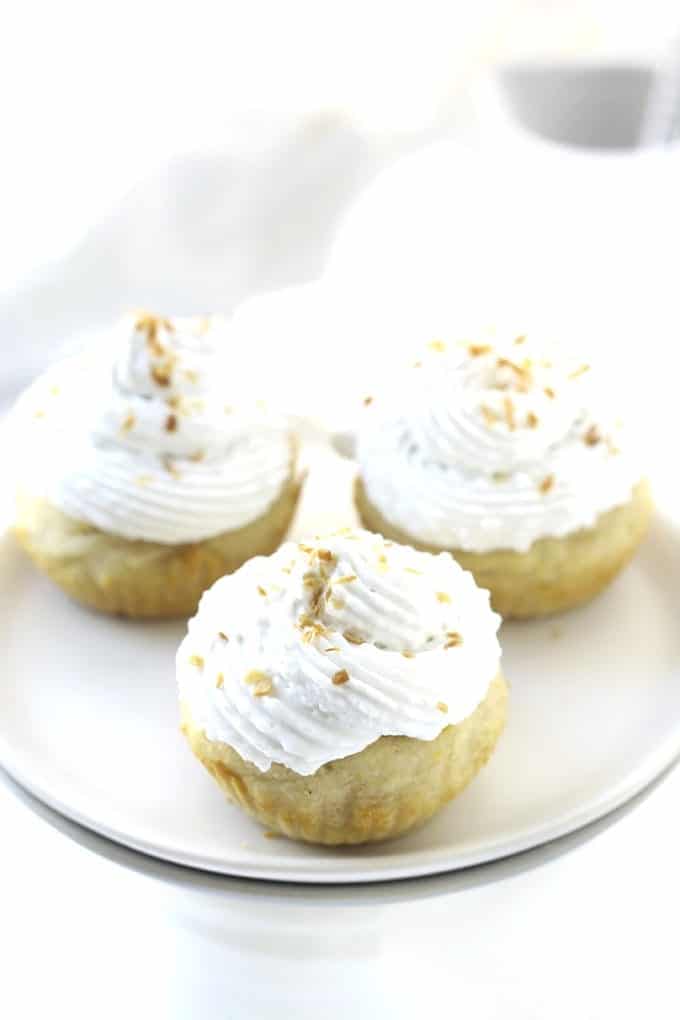 - Place frosting in piping bag and pipe over cupcakes in a circular motion. OR frost cupcakes using a knife. Top with toasted coconut, if desired.