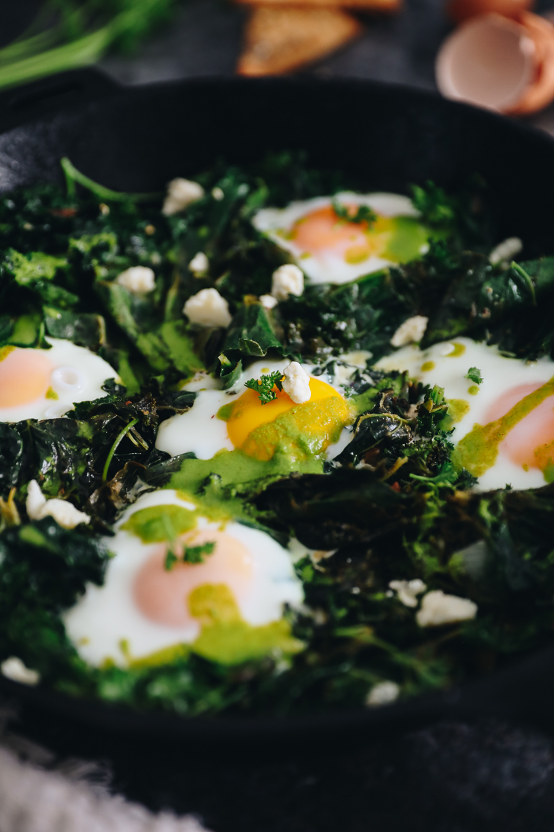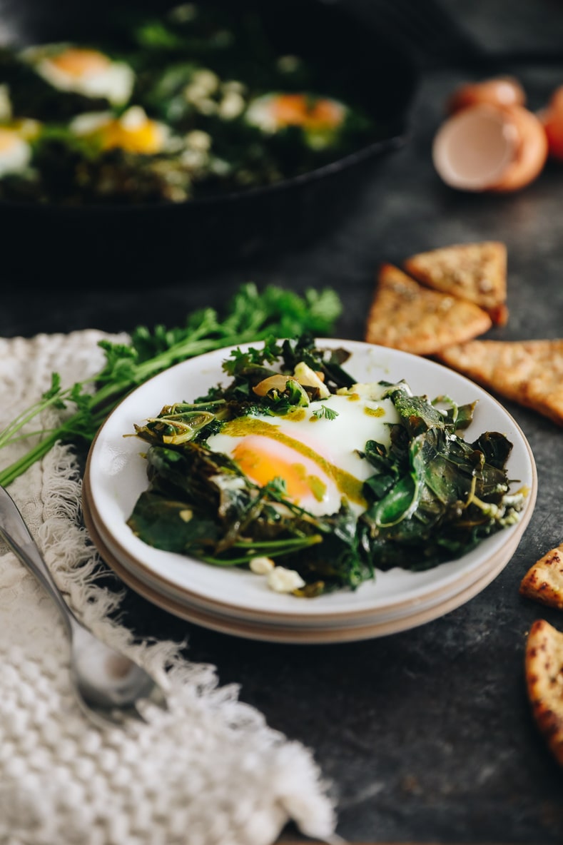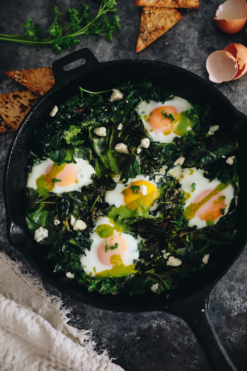 Essentially green shakshuka is sautéed greens and herbs topped with eggs and yogurt. Instead of poaching the eggs in tomato sauce, you poach them in the cooked greens/herbs mixture.