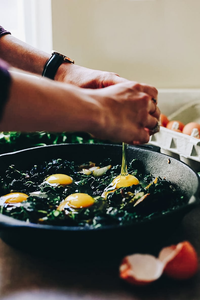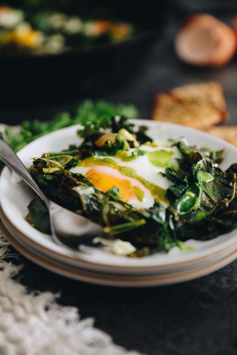 As you guys know, I’m a total veggie freak so I literally swoon at any meal that is bright green. And then I tasted it, and holy cow my mind was blown. The version I had in Israel was made with Mangold leaves, but I had a super hard time finding them here. So instead I used kale and beet leaves. You can use whatever greens and herbs you have. That’s what makes this green shakshuka recipe so magical, it’s easily customized!