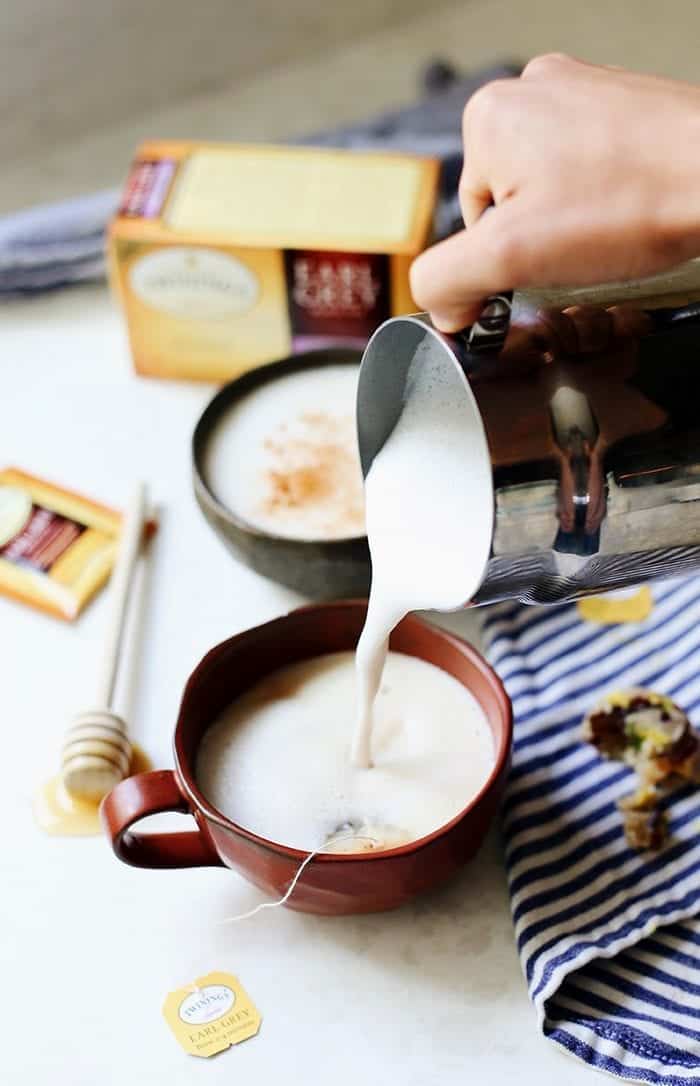 - Stir sweetener in with steeped tea and top with frothed milk.