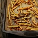 - Flip fries once more and return to oven for 5-10 minutes depending on how crispy you like them. This time will vary as everyone’s bakeware, oven and potatoes are different.