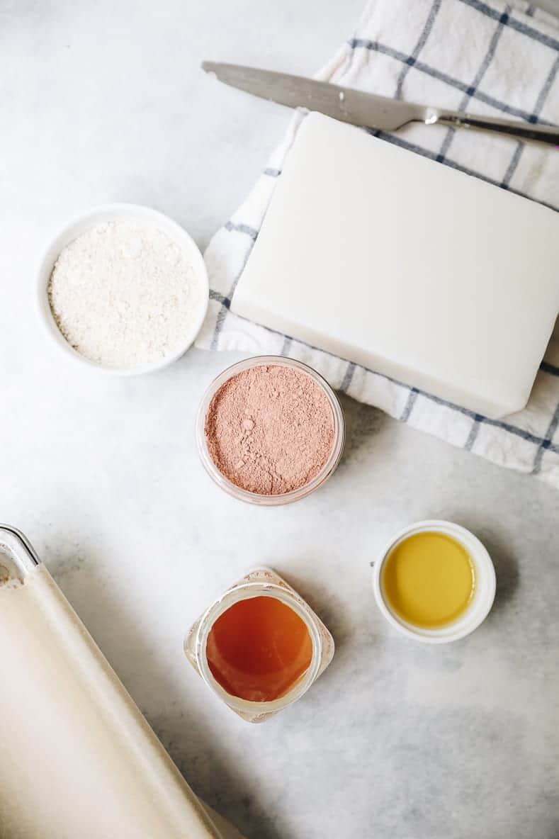 Gather and measure out all of your ingredients. Cut your melt + pour soap into small cubes (recipe calls for 1 lb which is half of a traditional 2 lb block). No need to measure, just estimate half. If you don’t have a silicone soap mold, line a loaf pan with parchment paper.