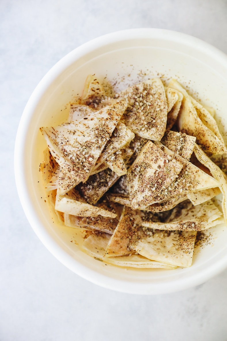 - Add pita to a large bowl and drizzle with olive oil until each chip is fully coated.