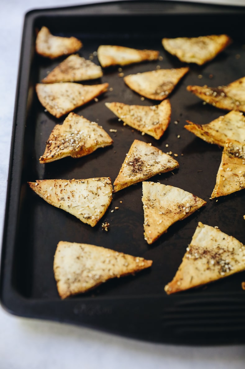 Add chips to a large bowl and while tossing with your hand, drizzle olive oil into bowl. Make sure all chips are well coated. Top with za’atar or seasoning of choice (see below for ideas).