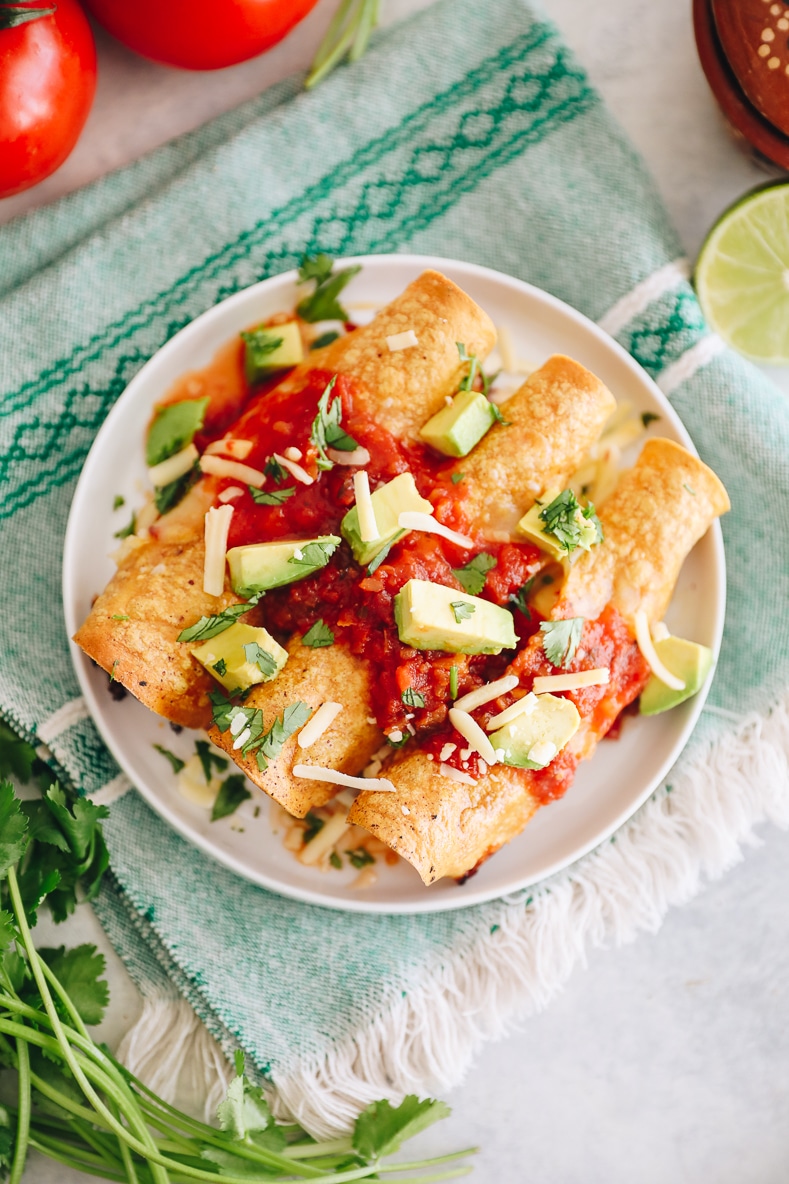 STEP 5: Top taquitos with salsa, avocado (or guac) and optional toppings for serving.
