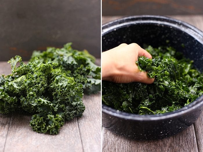 - Massage liquid until kale until it has completely wilted. This will take around 3-5 minutes.