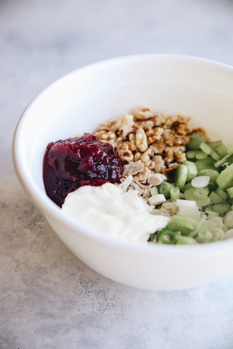 As you can see from the photos your turkey cranberry salad may have a pinkish hue. That’s just what happens when you mix it with cranberry sauce. It still tastes delicious.