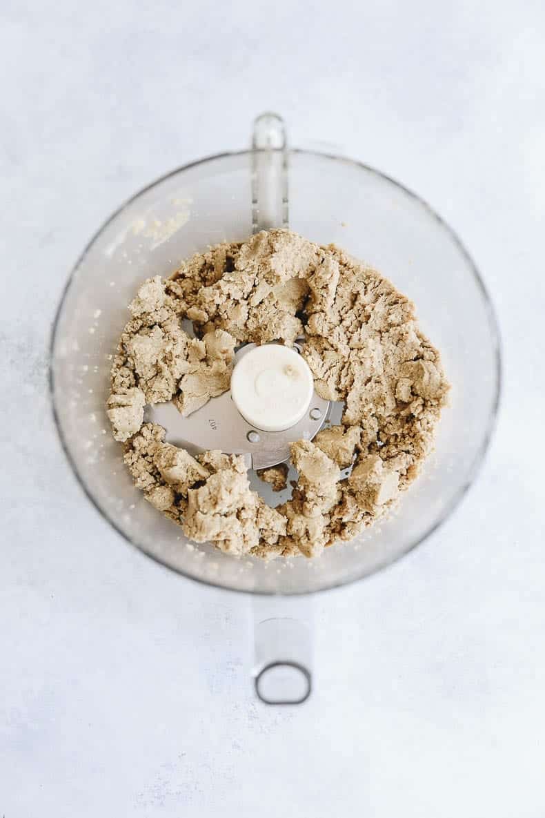 - Blend the cashews, protein powder, coconut oil, honey, coconut flour and a small pinch of salt in a food processor until you have a smooth, well blended dough.