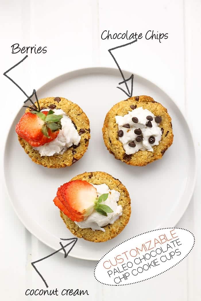 Who needs a cup when you can eat out of a cookie?! Customize your Paleo Chocolate Chip Cookie Cups by filling them with coconut cream, berries, more chocolate or whatever your heart desires! All you need is a muffin pan and a lot of love.