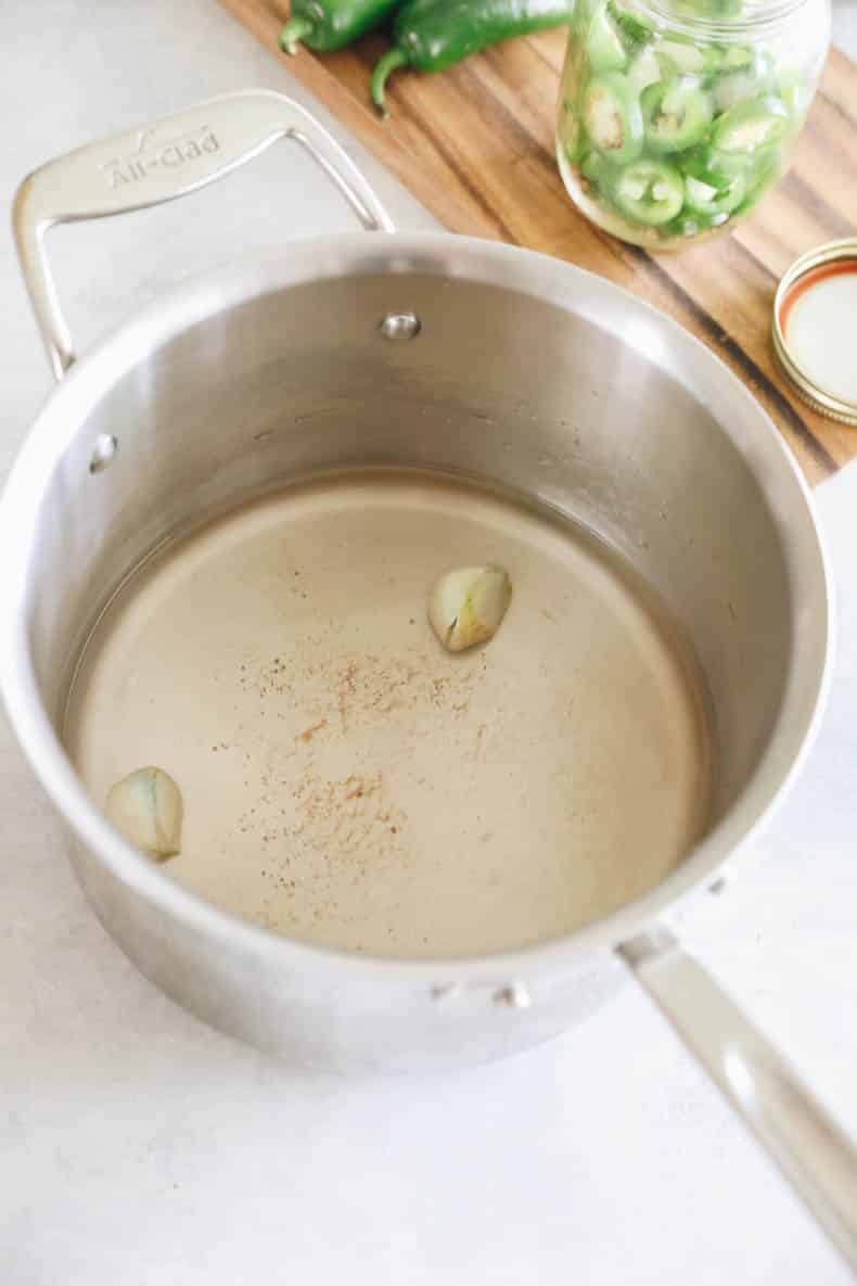 - Into a large pot add your garlic cloves, distilled vinegar, water, cane sugar and salt. Bring to a boil and keep cooking until sugar and salt are completely dissolved. Remove from heat and allow to cool to room temperature (you can add your brine hot but the jalapenos won’t remain crunchy).