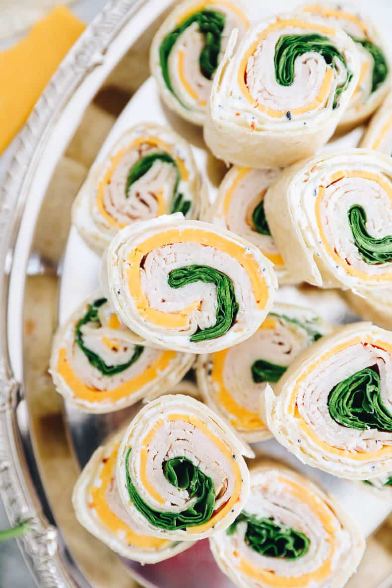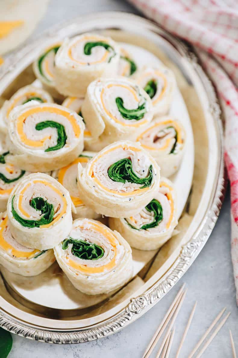 pinwheel sandwiches with turkey, cheese and spinach on a silver platter
