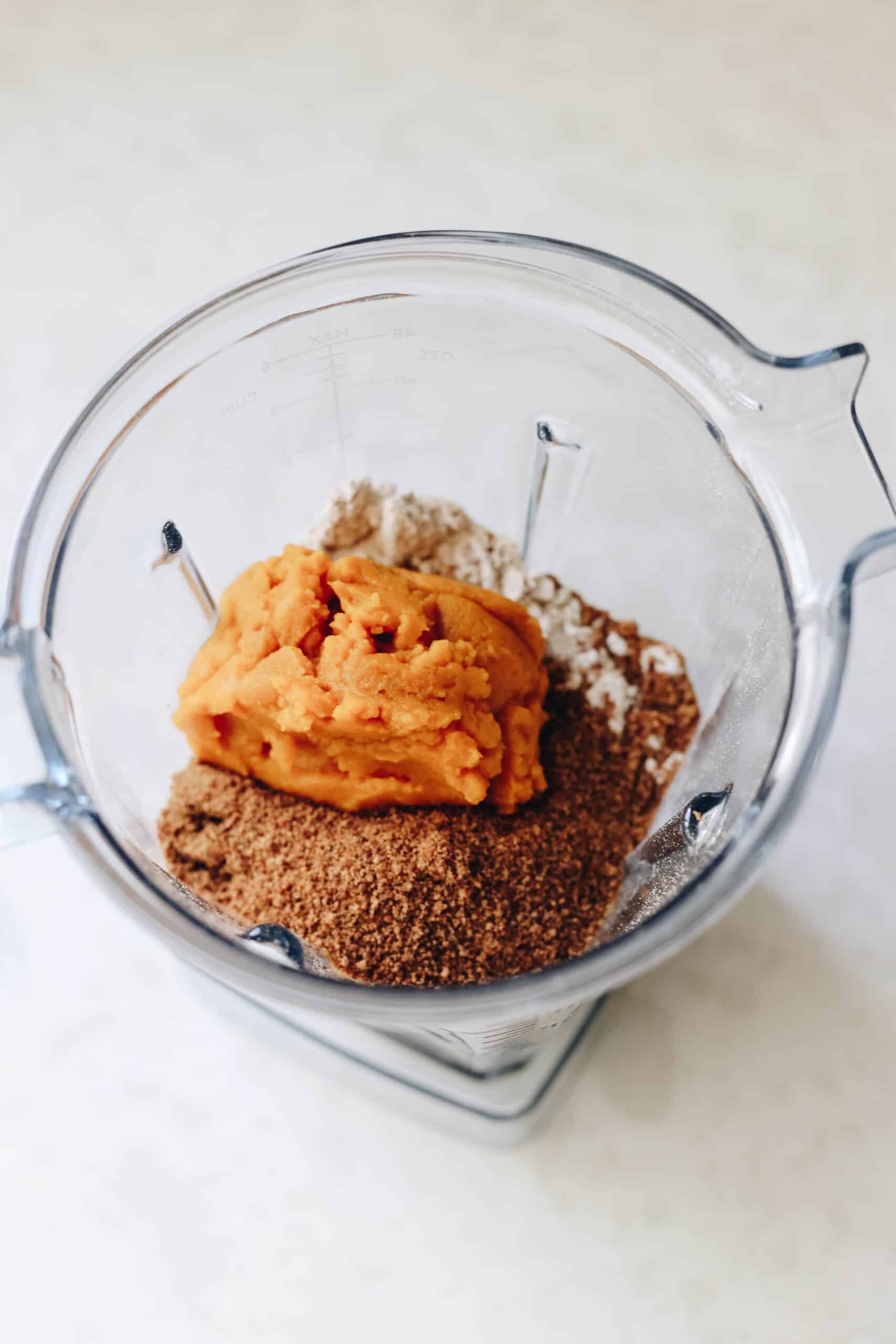 - Add in pumpkin, almond milk, vanilla and two eggs and blend until just combined.