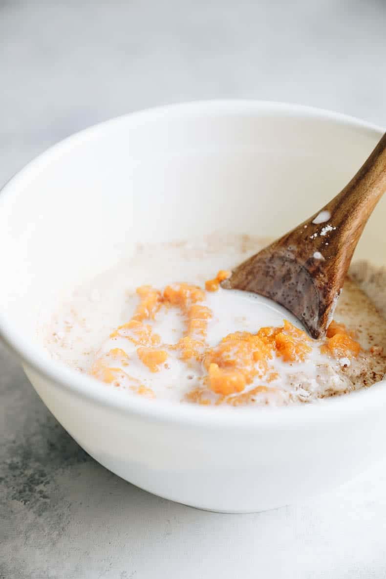 - In a separate bowl combine coconut oil, almond milk, pumpkin puree and vanilla extract.