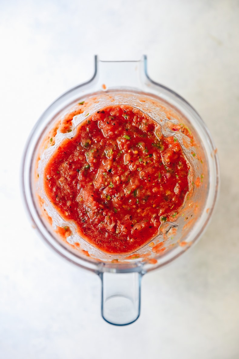 There’s really only 1 simple step to making your restaurant salsa. Just add all of your ingredients to a blender or food processor and pulse! The important part is to not over-process your salsa. For a thicker salsa pulse just a few times. For a thinner one pulse up to 10 times. I use my Vitamix but any high-speed blender or food processor will work.