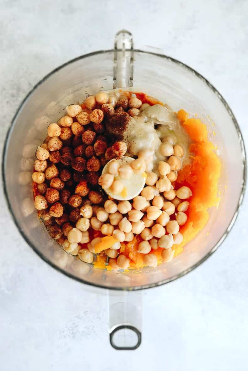 7. Add butternut squash, 1 1/2 tbsp olive oil, chickpeas, tahini, garlic, lemon and water to a food processor or blender and process until smooth.