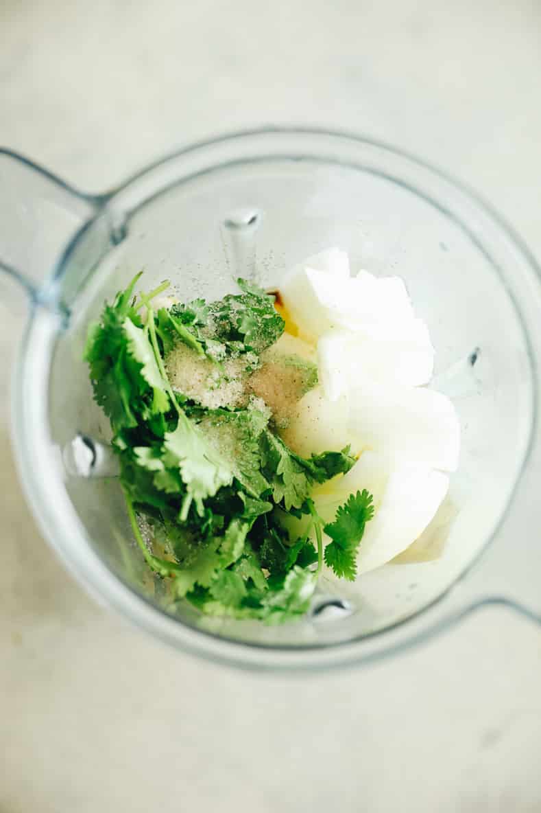 - Add tomatillos and jalapeños to a blender or food processor. Top with garlic, cilantro, onion, lime juice, and salt and pulse the mixture until it reaches your desired consistency. If too thick feel free to add in a few tablespoons of water.
