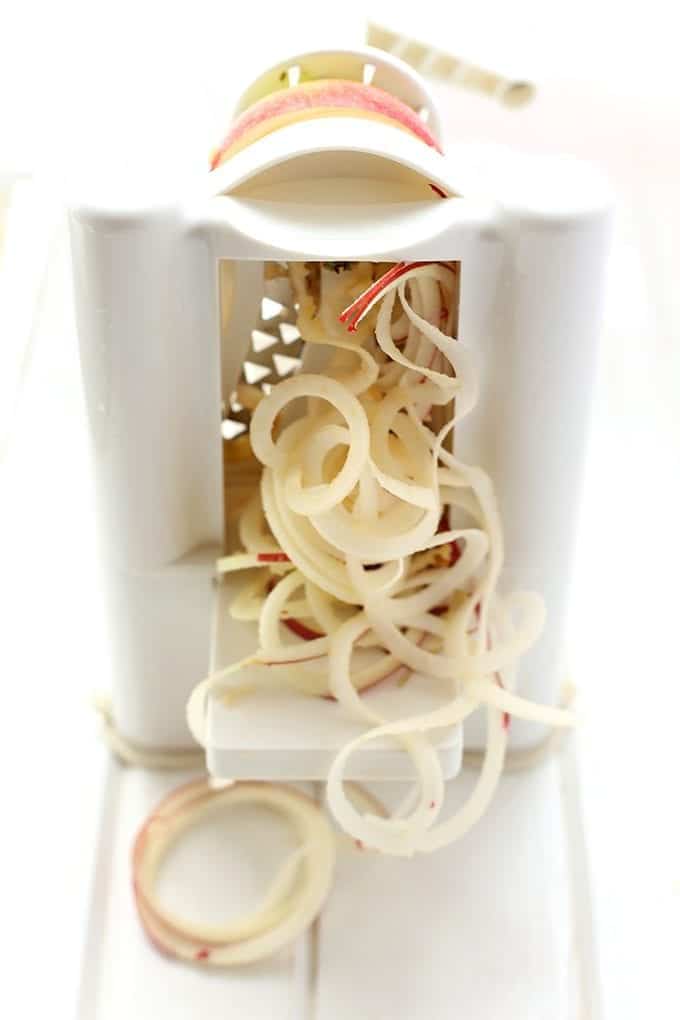Then when it comes to chopping, you won’t be needing to deal with that anymore because you can spiralize an apple in full! It takes about 20-30 seconds per apple to spiralize, which means you now have more time for crumble eating instead of crumble baking.