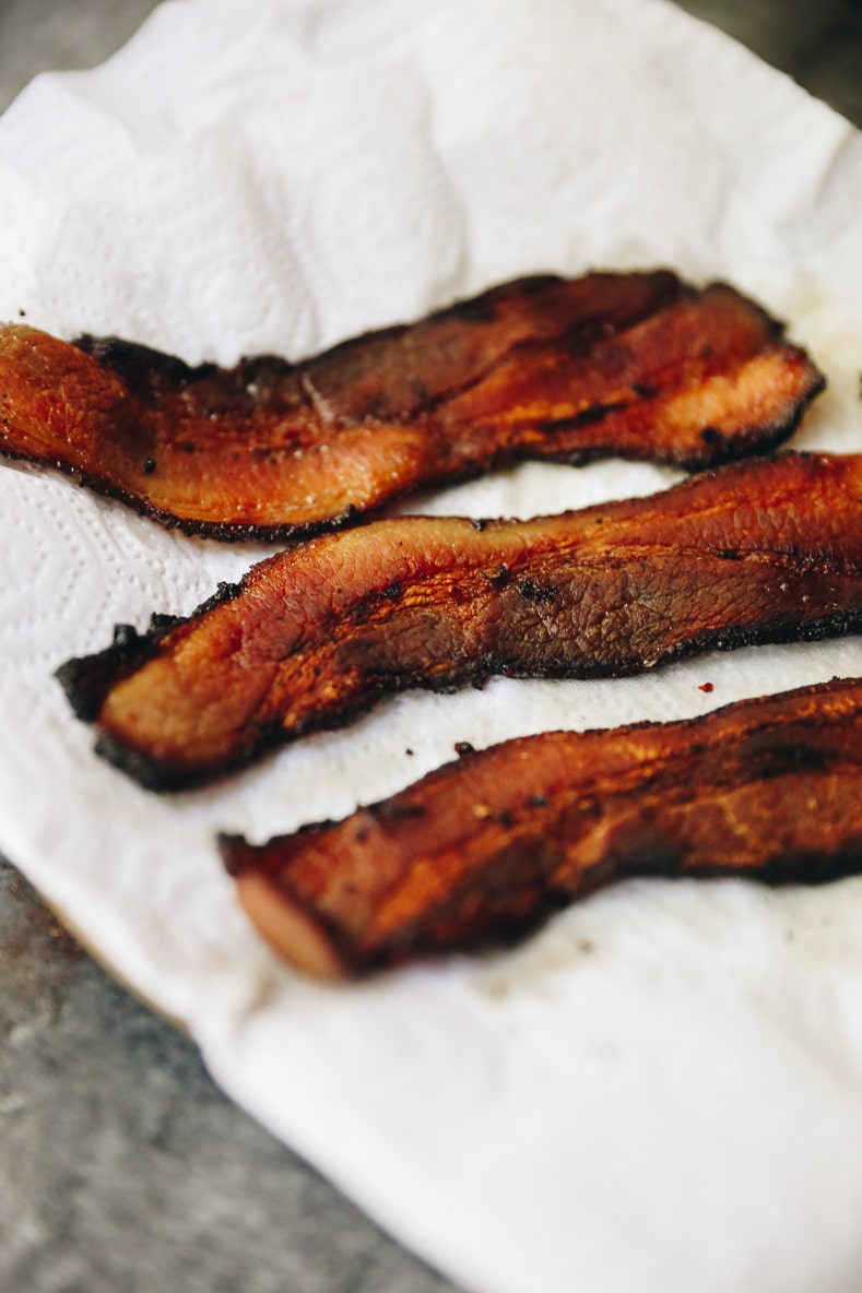 Oven: Preheat your oven to 400ºF. Line a baking sheet with foil and line the bacon across the pan. If possible, try not to overlap the bacon to make sure it crisps evenly. Bake for 15 minutes and then check to see how crispy it is. Keep a close eye on it after 15 minutes because it cooks quickly! HERE is a full tutorial.