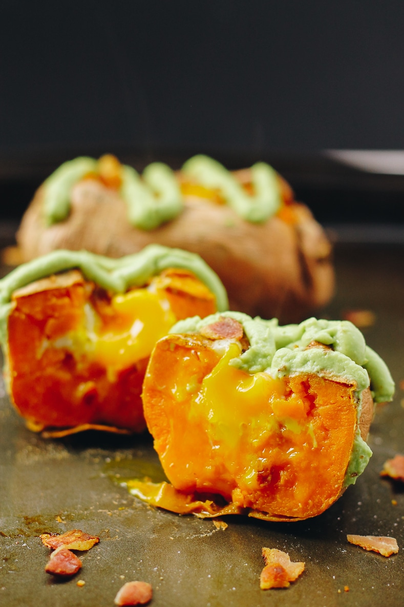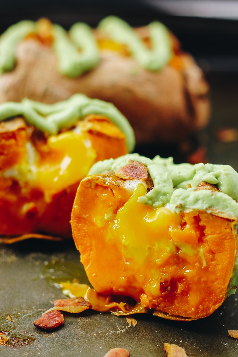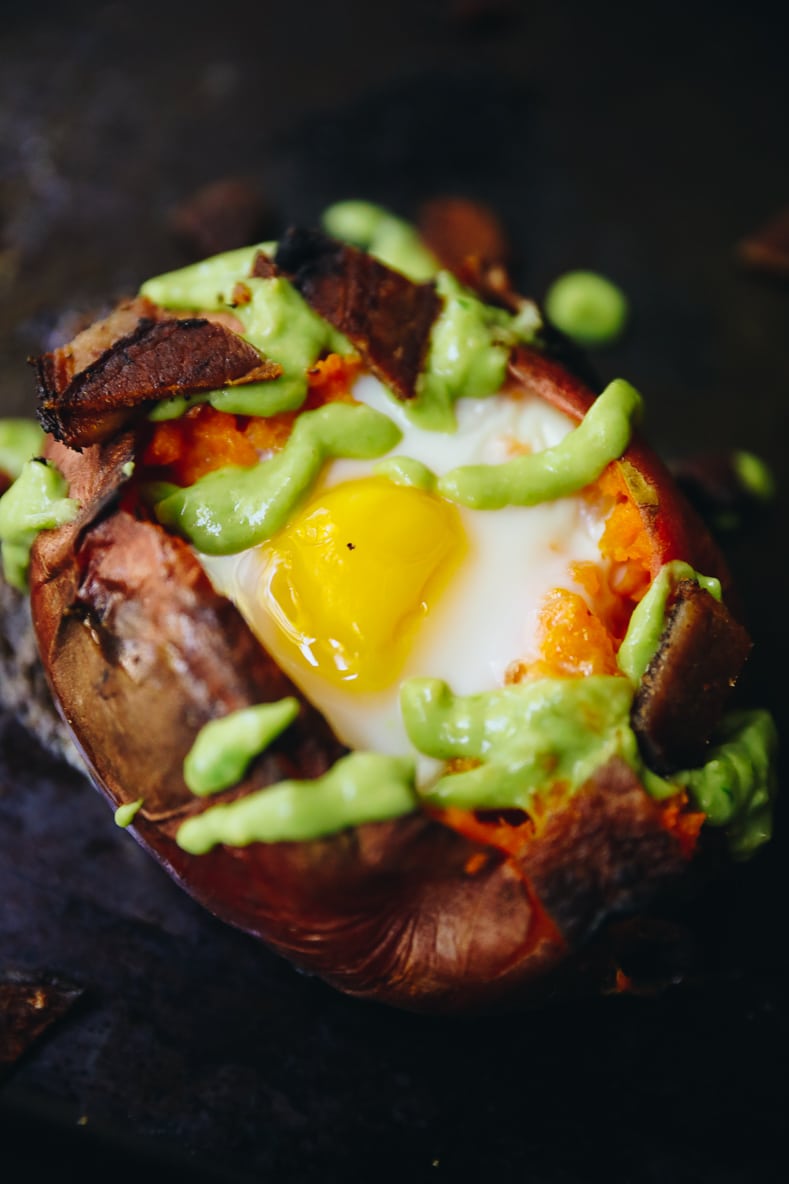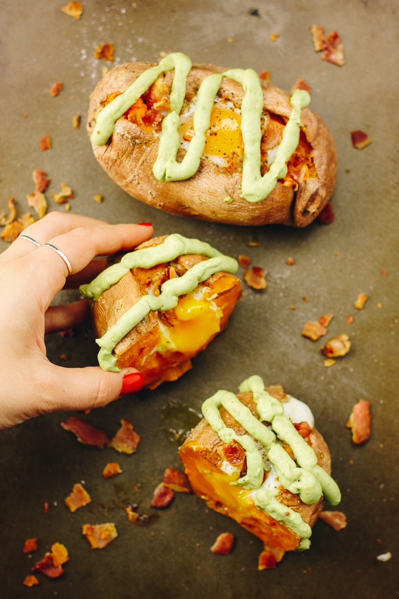 Sweet Potato Egg Boats with Avocado Crema and Bacon