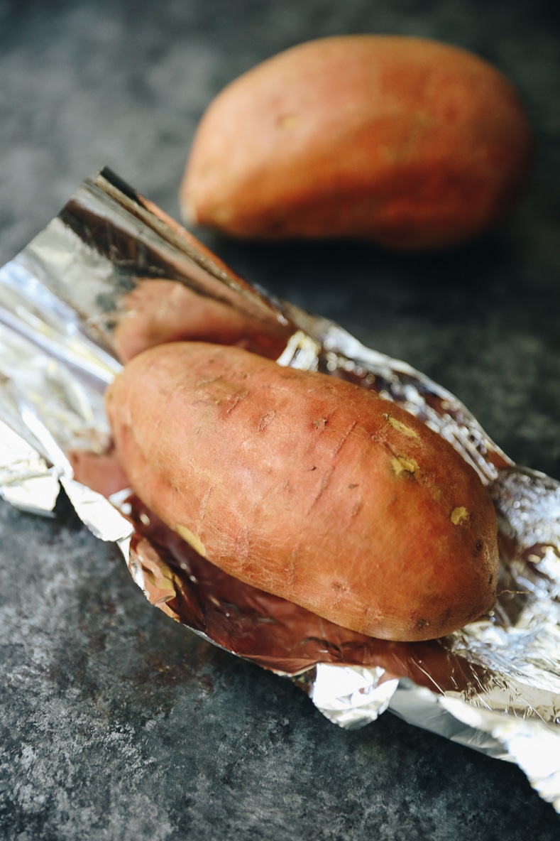 STEP 1: Preheat the oven to 400ºF. Poke your sweet potatoes with a fork a few times and wrap in tinfoil. Bake for 50-60 minutes.