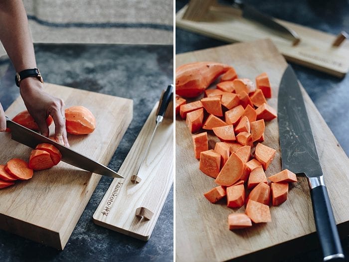*To make my mashed sweet potato I peel and chop 1 large or 2 medium sweet potatoes, before adding to boiling water and cooking on high for 12 mins. Strain and mash by hands or in a blender.