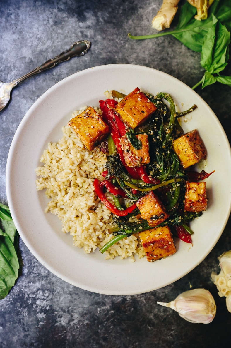 Don’t like tofu? Feel free to replace with any other protein. Thai basil chicken, beef or even chickpeas would work great. You can use pre-cooked or follow the same instructions as the tofu to get a nice crispy taste on your protein. You can also top it with a fried egg!