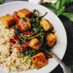 An easy recipe for Thai Basil Tofu that is ready in under 30 minutes. Easy swaps are available to make this Thai Tofu vegetarian and whether or not you can find Thai Basil doesn’t matter much for a delicious dinner the whole family will love.