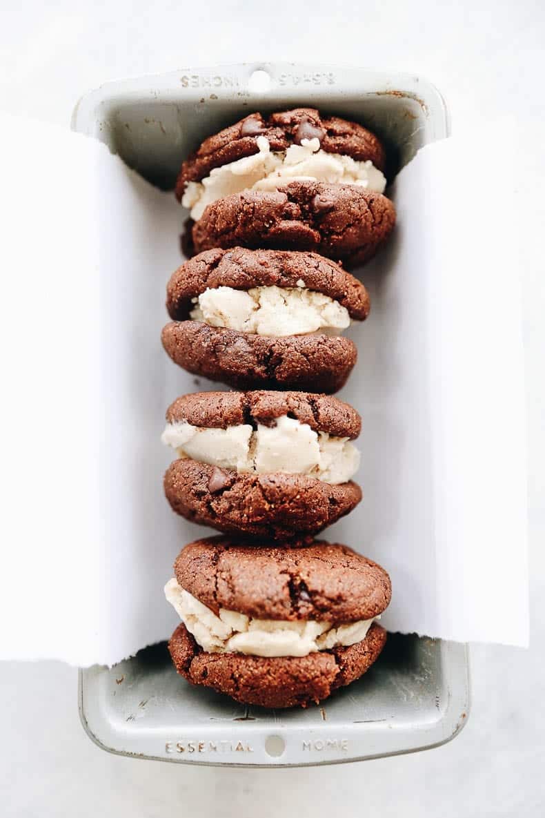 The key to making your own ice cream sandwiches is to use cookies that have cooled completely! After baking, transfer the cookies to a wire rack to cool completely or pop them in the freezer to speed up the process! When it’s time to make the sandwiches, take one cookie and carefully scoop ice cream on it, gently press on the second cookie and enjoy immediately! You can make all the sandwiches ahead of time and store them in the freezer or just make each sandwich as you want to eat them.